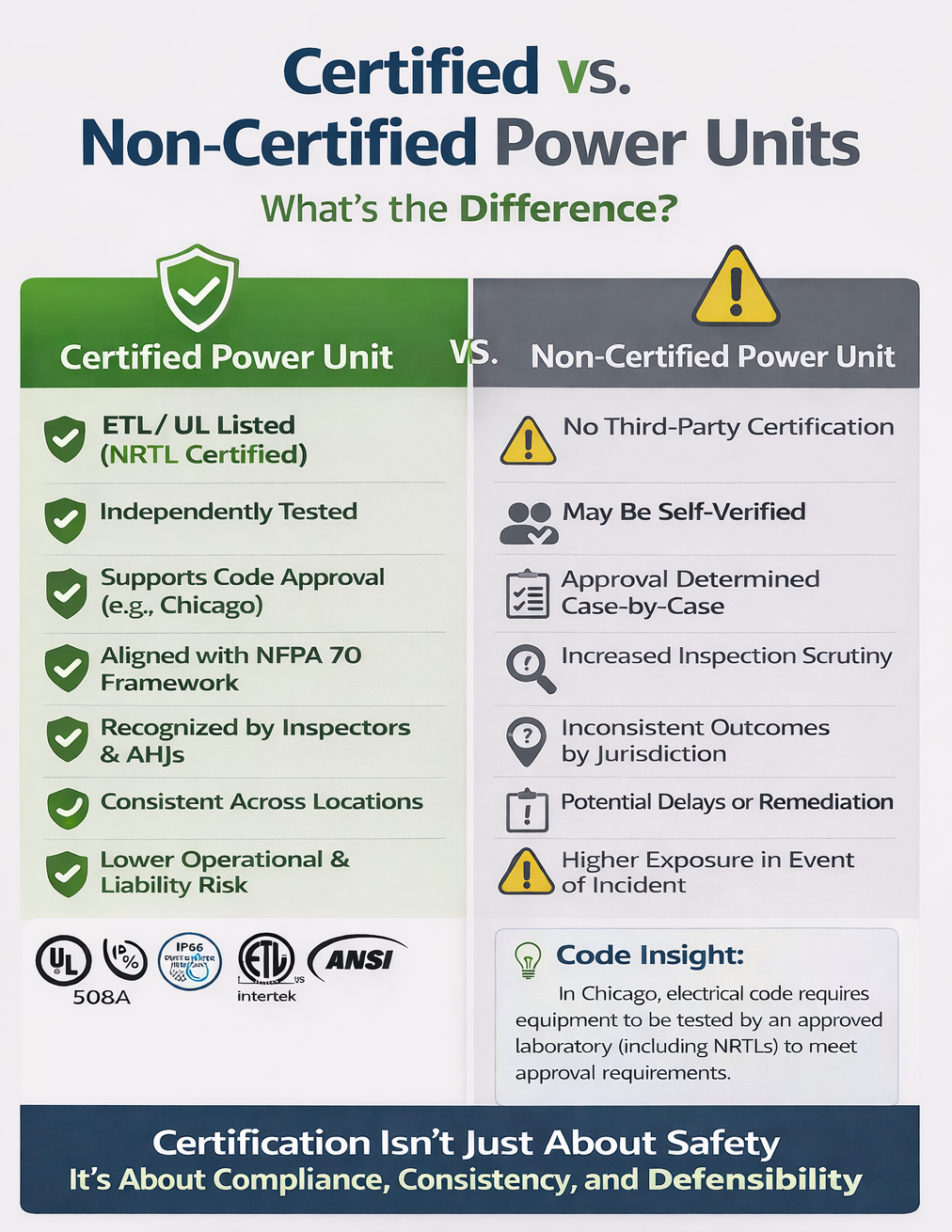 If a power unit fails—or doesn’t meet local electrical code—the consequences can extend far beyond equipment downtime to include failed inspections, operational disruption, and liability exposure.